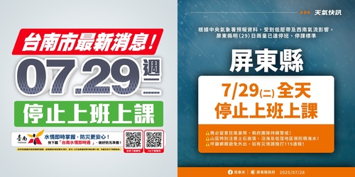 台南市及屏東縣政府公佈全日停班停課,